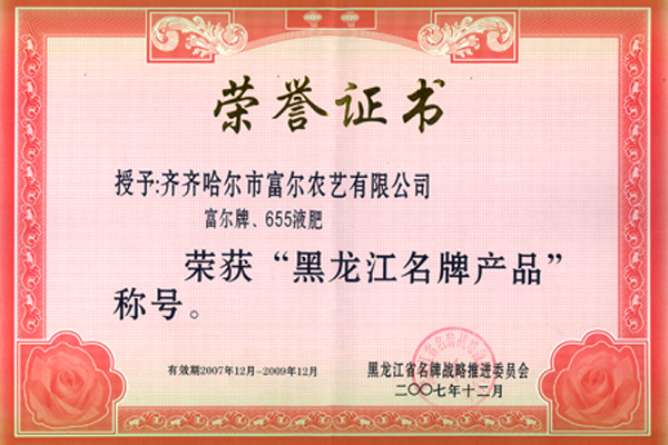 2007年12月,黑龙江省名牌战略推进委员会授予齐齐哈尔市富尔农艺有限公司富尔牌、655液肥荣获“黑龙江名牌产品”称号