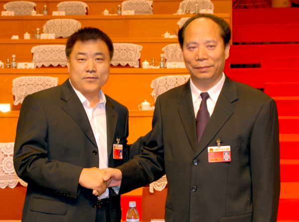 黑龙江省十一届人大二次会议上,全国人大常委会副委员长、时任黑龙江省委书记、人大常委会主任吉炳轩(右)与人大代表、富尔农艺有限公司董事长张立(左)亲切交谈。