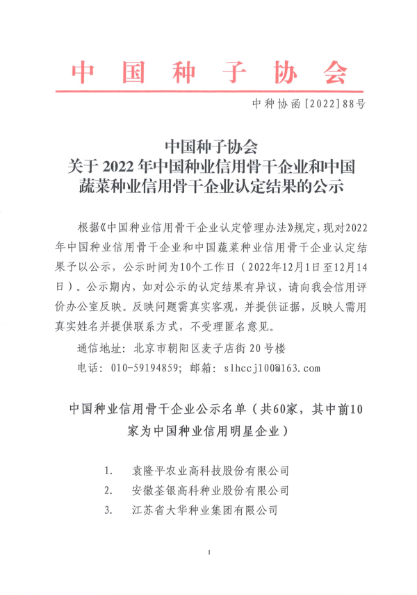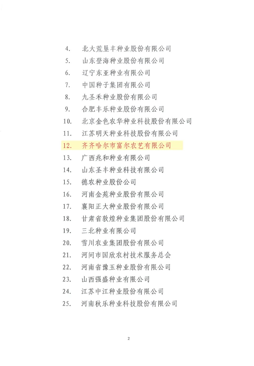 2022年12月1日,中国种子协会发布了《关于2022年中国种业信用骨干企业和中国蔬菜种业信用骨干企业认定结果公示》的文件(中种函{2022}88号)。齐齐哈尔市富尔农艺有限公司榜上有名,排名继续稳步上升,位列2022中国种业信用骨干企业第12位。
