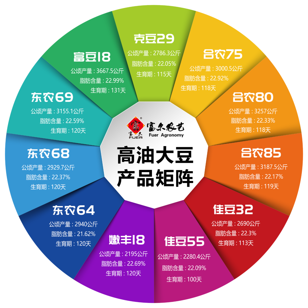 为了解决大豆生产“单技术为主、小面积示范”的传统推广模式为主和大田生产技术到位率不高的实际问题,以及“多技术集成、大面积普及”推广模式还未有效形成的现实,富尔农艺于国家级大豆良种生产基地五大连池市托管高标准农田100公顷,投入资金200余万元,组织体系内大豆科研、生产、销售人员30多人和4家科研单位技术人员12人,联合打造了“五大连池市富尔农艺超高油高蛋白高产大豆当家品种多技术集成高标准展示区”,其中功能区分为国家大豆科研展示与示范区、核心品种原原种扩繁区、院企合作展示区、黑龙江省第五积温带育种家品种展示区、超高油高蛋白高产多技术集成区、富尔农艺当家品种展示区、药剂试验区、育种杂交与世代筛选核心区、四圃项目整理区、大豆联合体试验区。据统计,参试参展大豆品种总计达到160余个,主要有我省市场主推大豆品种80余个,潜力大豆品种50余个,待审大豆品种30余个。其中参展的富尔农艺当家大豆品种55个,高蛋白产品17个,高油产品11个,芽豆产品1个、其它类型产品26个,参试的潜力和待审品种20个左右。基本实现了对东北三省一区大豆种植区的无死角,全覆盖,并满足了市场的多样化、多层次、多角度的细分需求。