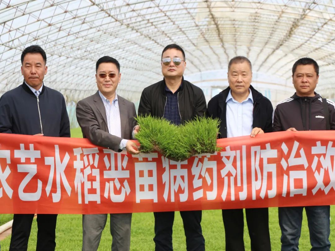注:水稻药剂处理现场,宋维波总经理和刘得总监与张立董事长共同见证“凌跃”水稻恶苗病防治效果。