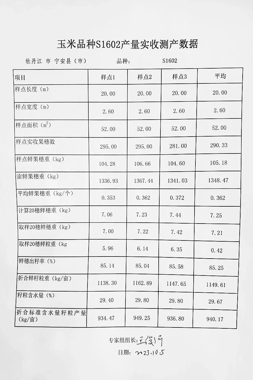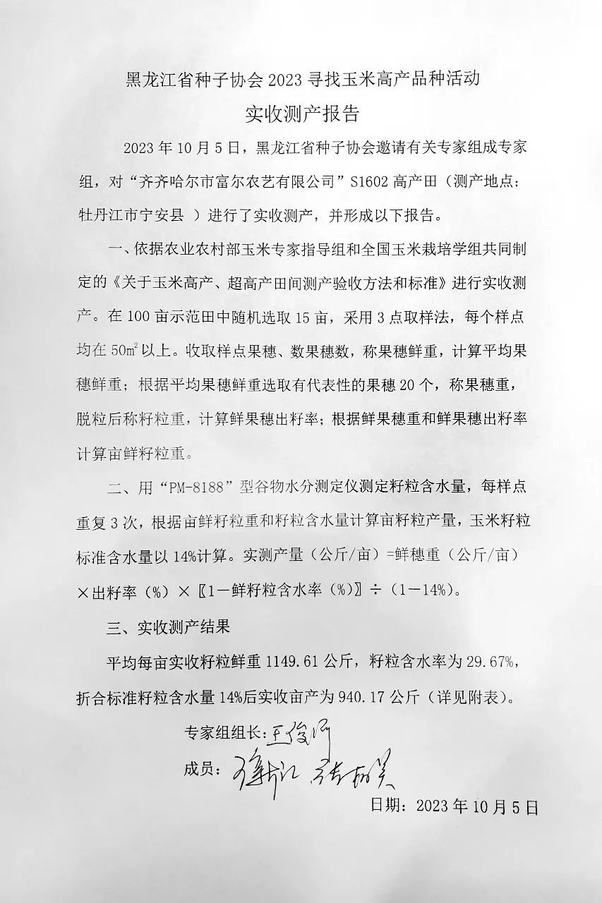 2023年10月5日,由中国种子协会主办的“2023年寻找高产玉米高产品种”活动中,富尔农艺与中种国际合作玉米高产新品种“S1602”玉米在牡丹江市宁安市种植的100亩高产田地块进行专家现场田间测产,获得折合14%标准水分平均亩产940.17公斤的高产量,位列该组高产榜第一名。