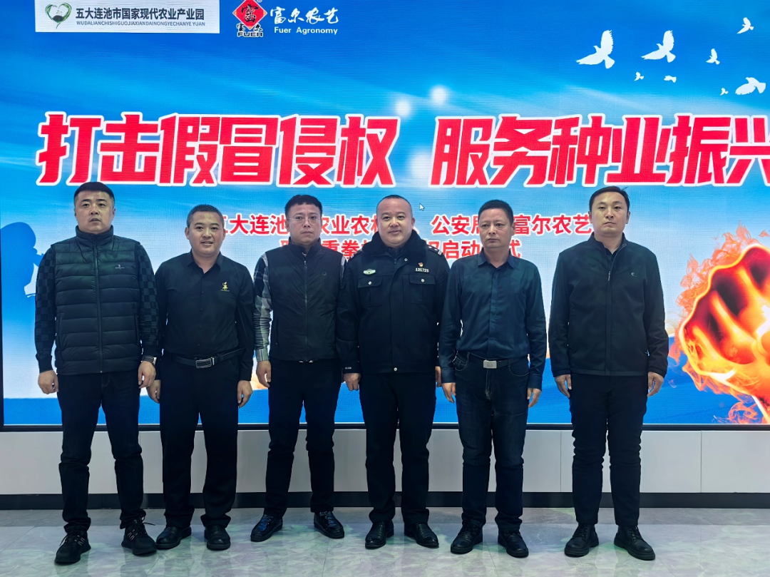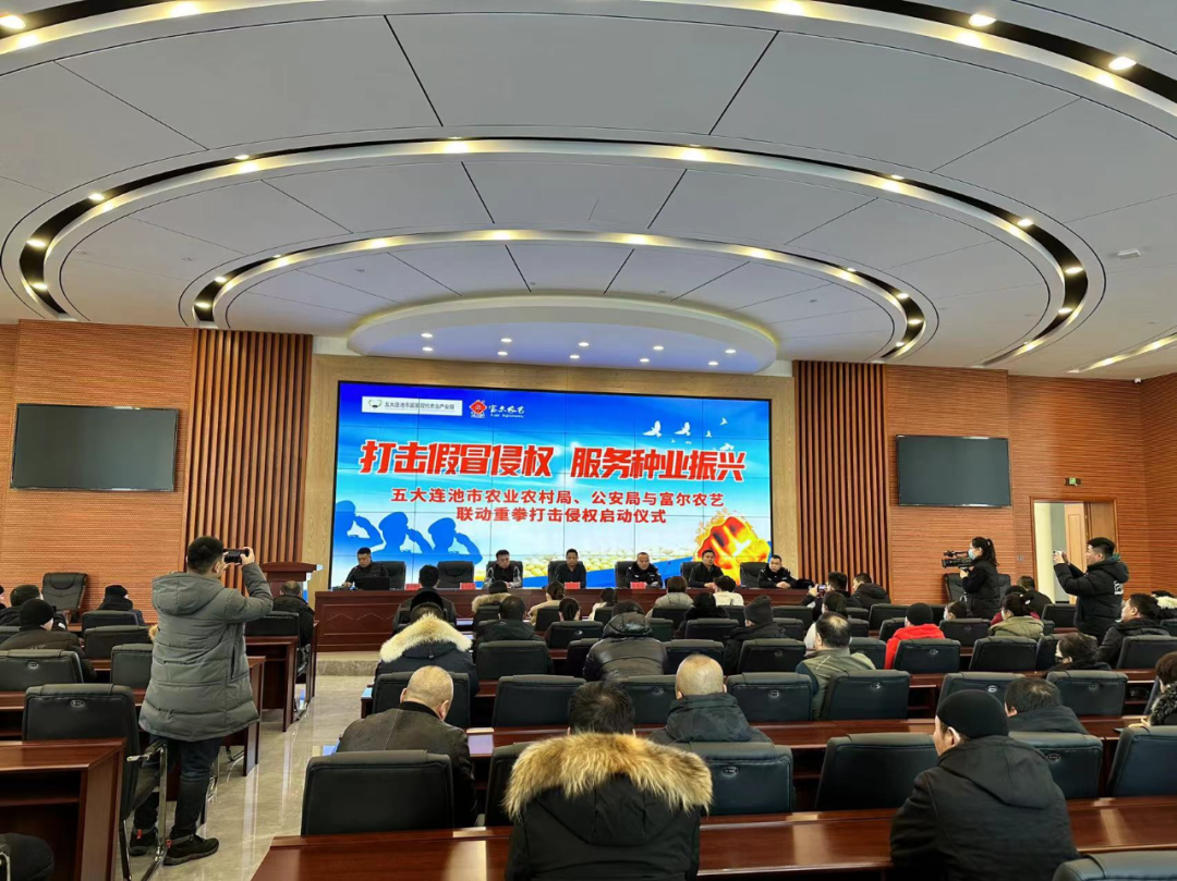 2023年12月13日,五大连池市农业局、公安局与富尔五大联合开展“打击假冒侵权,服务种业振兴”行动启动仪式,在五大连池市现代农业产业园隆重召开。五大连池市农业农村局副局长纪洪坤、公安局食药环侦大队大队长王勇、现代产业园主任王凯、种子管理站站长叶永梅与富尔农艺首席战略官张鑫,法务部部长韩永光、富尔五大连池市农业科技有限公司董事长施海鹏、营销副总孙儒杰等领导出席,以及五大连池市融媒体、大豆种子经销商、合作社、种植大户代表等共80余人出席会议,会议由富尔五大营销副总孙儒杰主持。