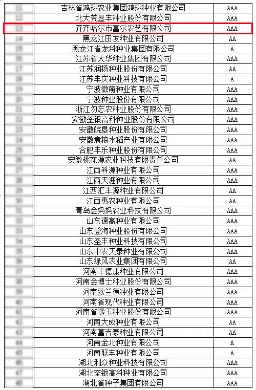 2023年12月8日,中国种子协会发布文件《中国种子协会2023年种子行业信用评价结果公示》,齐齐哈尔市富尔农艺有限公司荣获“中国种子协会2023年种子行业信用评价AAA级信用企业”。