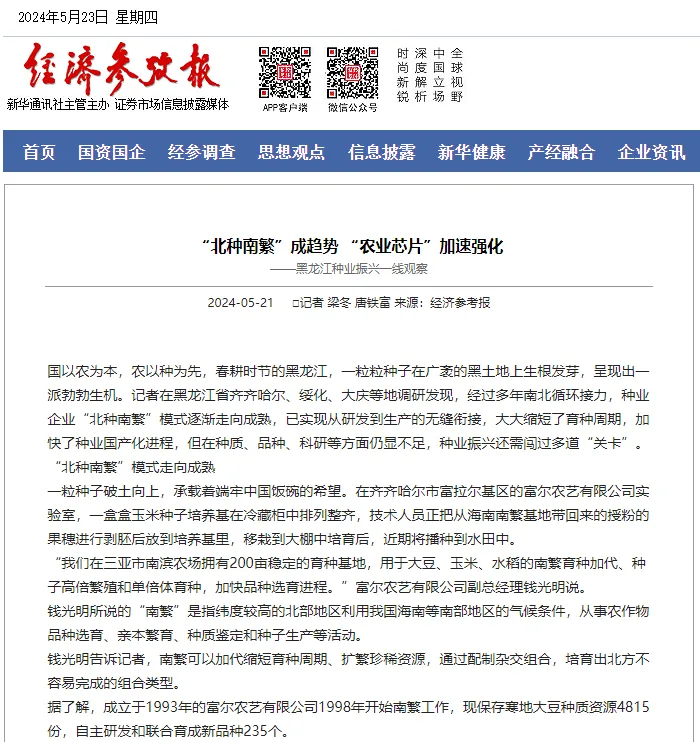 编者按:5月21日,《经济参考报》以“‘北种南繁’成趋势 ‘农业芯片’加速强化”为题报道了以头部种企富尔农艺为代表的一批黑龙江种业企业,为了突破技术“卡脖子”问题,实现种业振兴,保障国家粮食安全,尤其是通过北种南繁加代选育在种业关键核心技术攻关、部分种子核心种源、新品种培育等方面所做的努力做了全面报道,以下为部分报道内容。